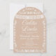 Celebrate your little one's arrival in style with this beautiful Mexican-inspired baby shower invitation. Featuring elegant white papel picado banner, delicate floral folk art border, and two lovebirds at the bottom on a warm Beige background in a chic arch shape. The stunning "Cielito Lindo" script makes this design perfect for a fiesta-themed baby shower.