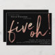 Cinq Oh 50e anniversaire Black Rose Gold Foil Invitation personnalisée. Invitation de fête d'anniversaire humoristique mais élégante, avec design avec police de brosse élégante en fausse feuille d'or. Contactez le créateur si vous avez besoin d'aide pour customiser cette conception en cliquant sur le bouton "Message" ci-dessous.