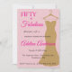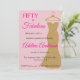Invitation d'anniversaire 50 ans minimale rose, or et noir moderne avec le texte "Cinquante ans et Incroyable" que vous pouvez personnaliser et envoyer pour votre célébration d'anniversaire de cinquantième anniversaire. Les mots "Cinquante ans et Incroyable" sont placés sur un fond rose, avec une typographie de police de caractères rose chaud populaire, à côté d'une élégante et sophistiquée robe de soirée dorée sans bretelles.