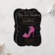 Cinquante et fabuleux texte de chaussure rose vif brillant sur l'invitation d'anniversaire noir. Chaussure à talon rose chaud brillant avec texte or avec vos propres informations. Des points roses saupoudrent l'invitation. Glamour et moderne.