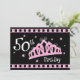 Veillez à traiter votre reine d'anniversaire comme le pourcentage avec ces cinquantième invitations de fête d'anniversaire d'amusement. Comportant un diadème rose couvert en bijoux sur un fond noir. Le texte avant indique le cinquantième ANNIVERSAIRE. Le texte entièrement personnalisable soutiennent dessus pour toute votre information de partie. Timbres-poste coordonnés, T-shirts, sacs fourre-tout, tasses, autocollants et plus aussi disponible. Original de PinkInkArt !