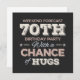 Citation de citations drôles pour 70 ans avec une phrase humoristique comme Prévisions de week-end Fête des 70 ans avec une chance de câlins. Joyeux 70e anniversaire pour célébrer l'anniversaire de vos proches par exemple votre grand-mère, grand-père, père, mère, oncle ou tante. Idée cadeau pour 70e anniversaire.