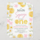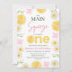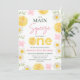 Lemon Yellow Slices Our Main Squeeze 1st Birthday Invitation Lemons thème de la première invitation fille anniversaire avec quelques tranches de citron, un soupçon de feuillage et quelques fleurs rose et blanc. Cette invitation au premier anniversaire au citron comporte également un titre de calligraphie non modifiable et le mot un utilisant une tranche de citron.