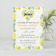 Joli et amusant design de douche nuptiale avec un thème citron. L'arrière - plan de l'invitation est blanc avec un motif de citrons et de feuilles verts. Au centre se trouve une zone rectangulaire blanche avec un coeur en haut. Le coeur est composé des mêmes citrons et motifs feuille. Il y a du texte personnalisable en police noire où vous pouvez ajouter le nom de la mariée au coeur. Sous le coeur citron est un texte personnalisable en police noire où vous pouvez ajouter tous les détails de la douche nuptiale. Le revers de l'invitation a les mêmes citrons et motif feuille vert. Cette jolie décoration principale à thème citron pressé est parfaite pour les wedding showers et les mariés !