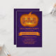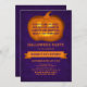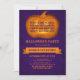 Amusant et engageant invitation d'anniversaire Halloween. Violet foncé et orange. Gros jack-o-lanterne aux yeux et à la bouche brillants et un message d'accueil écrit dessus. Idéal pour une fête costumée d’Halloween pour un enfant.