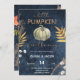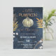 Conçue pour notre collection de Baby showers Citrouilles automnaux, cette carte d'invitation personnalisable comprend arrière - plan bleu marine, citrouille vert, texte parties scintillant or et feuilles or avec polices d'écriture manuscrite. Éléments correspondants disponibles.