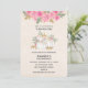 Une invitation d'anniversaire avec des citrouilles blanches peintes à l'aquarelle et ornées de paillettes dorées fausses. Entourées de feuilles vertes et de fleurs sauvages roses.