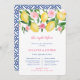Cette carte d'invitation Mariage Rehearsal and Dinner propose des citrons d'aquarelle et des fleurs roses à l'avant ainsi qu'un inversé en tuiles méditerranéennes bleues et blanches.
