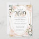 Un cadre ovale or de forme libre donne à ce cadre de graduation sa structure globale. Le cadre doré est décoré avec les roses roses roses roses et feuilles verts sauge les plus douces. Une aquarelle rose pâle, tapissée de flocons d'or, embellit encore le design. 2019 est écrit en grands nombres d'or orné d'un design floral rose et or. Un lavement à l'aquarelle rose doux embellit l'arrière de l'invitation de graduation.h