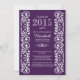 Belle classe de 2015 invitation de graduation avec une frontière tourbillon de fantaisie vintage encadrant vos informations de fête de grad set sur un arrière - plan violet. Personnalisez simplement vos informations de fête et vous êtes tous prêts à partir. Disponible dans notre boutique dans une variété de couleurs scolaires populaires. Parfait pour un diplôme de filles, un diplôme de garçons, un diplôme d'études supérieures, un diplôme d'études secondaires, un diplôme d'études secondaires ou un faire-part de diplôme.