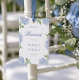 This beautiful design features an all around frame of blue hydrangea blooms and your custom text on the front and back. Punch a hole in the top and add your own ribbon to hang on a chair. Use the template form to add your information.