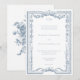 Announce your special day with an elegant traditional wedding invitation featuring a detailed, vintage-style engraving border of florals and ribbons in soft dusty blue. Perfect for a formal ceremony or an affair with a classic, timeless aesthetic. This refined design offers an opulent look. Created by Simply Farmhouse Press.
