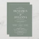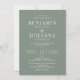Invitation de mariage classique et élégante avec un arrière - plan vert sage et des lettres blanches. Conception uniquement textuelle avec un libellé traditionnel. Options de papier imprimé numérique ou physique. Personnalisez-le avec les noms de M. et Mme, l'emplacement du lieu, le registre, les informations RSVP et tous les détails que vous devez inclure. Produits de suite correspondants disponibles.