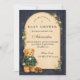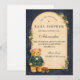 A charming preppy baby shower design featuring a sweet teddy bear dressed in a classic green plaid jacket and bow tie. Above the bear, a delicate clothesline displays tiny baby clothes and shoes, creating a nostalgic storybook nursery scene. The deep navy background and subtle tartan border add a refined, vintage-inspired touch that feels both elegant and playful. Perfect for a stylish baby shower celebration with a classic preppy aesthetic.