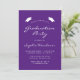 Cette invitation classique et moderne à la remise des diplômes comporte du texte blanc sur un arrière - plan violet. Le mot "Graduation" et le nom du diplômé apparaissent dans une police d'écriture moderne décontractée sous une paire de casquettes de tableau de mortier blanc. Customisez l'invitation avec les détails de la fête, et remplacez l'exemple d'image au dos par une photo de votre grade.