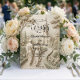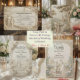 Evoke the grandeur of history with this faux bas-relief design featuring a classical romantic scene in monochromatic stone tones, perfect for formal cathedral ceremonies.This design utilizes a trompe-l'œil technique to simulate the appearance of a hand-carved limestone or plaster frieze. The composition leads the eye down a winding cobblestone path where a bride and groom, depicted in Grecian-draped silhouettes, walk toward a Gothic cathedral spire nestled among cypress trees and blooming rose bushes. The color palette is strictly monochromatic, utilizing shades of warm ivory, beige, and cool stone gray to enhance the depth of the digital shadows and highlights. The typography hierarchy balances elegant black calligraphy for names with traditional Roman serifs for the venue details, maintaining an organized, art-history-inspired layout.