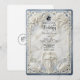 Set a tone of grand elegance for your estate wedding with this design featuring a faux bas-relief Baroque arch, musical angels, and a romantic blue palette.This design features a highly detailed, printed simulation of classical architectural carving. A central archway, rendered in the style of 3D white plaster, frames the text details against a faux dusty blue background. The artwork includes intricate bas-relief effects of blooming white roses, acanthus scrollwork, and two swans at the base. At the top of the column, a cherub angel playing a violin adds a touch of movement. The typography blends an ornate calligraphy script with a traditional serif font in dark charcoal grey for readability.This is a flat printed image with a faux stone texture effect, not actual raised material or embossed paper.