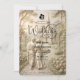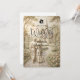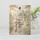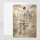 Evoke the timeless grandeur of classical sculpture with this faux bas-relief design, capturing an old-world romantic garden scene in monochromatic cream.This design features a sophisticated trompe l'oeil technique mimicking the look of carved sandstone or plaster. The layout centers on a statuesque couple in flowing robes walking down a stone pathway toward a traditional chapel steeple, framed by a dense floral archway of roses. The monochromatic palette utilizes shades of ivory, beige, and cream to enhance the shadow and light effects of the faux sculpture. Text is presented in a hierarchy of deep charcoal gray, utilizing a striking Gothic Blackletter font for names alongside elegant serif details.This is a flat printed image with a faux stone bas-relief effect, not actual raised material or texture.