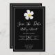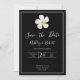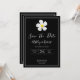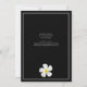 Un design moderne simple avec une fleur symbolique, un type de script blanc et un contour blanc sur le noir formel. L'arrière dispose de tous les détails mariages, personnalisez l'avant et revenez aux détails de votre journée spéciale. Un look classique pour une affaire formelle. Style correspondant sur Fête des mariées, RSVP, Enregistrer la date et bien plus. La fleur Hawaiian Lei, Plumeria est un symbole de "nouveaux débuts".