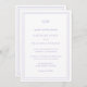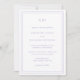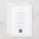 Faire-part de mariage de style classique violet / lavande avec un design simple et minimal avec votre monogramme en haut et vos détails de l'événement entouré d'une double bordure. Les fontes alternent entre un script élégant, une fonte serif traditionnelle et minimaliste sans serif. Le dos contient vos informations d'invité ainsi qu'un code QR optionnel (si vous préférez, vous pouvez supprimer le code QR dans l'outil de modification de conception). Cette invitation est idéale pour un mariage officiel.