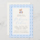 Célébrez l'arrivée d'un précieux petit trésor avec notre invitation intemporelle pour une baby shower, ornée d'un charmant ours en peluche et d'un motif classique de vichy bleu. Cette invitation dégage de la chaleur et de la nostalgie, parfaite pour accueillir le nouveau membre de la famille. Les douces teintes de vichy bleu évoquent un sentiment de tradition et d'innocence, tandis que l'ours en peluche ajoute une touche adorable de douceur. Avec son design classique et son sentiment sincère, cette invitation donne le ton pour une joyeuse réunion remplie d'amour et d'anticipation.