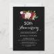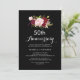 Cette classique invitation tropicale noire 50ème anniversaire de mariage est parfaite pour une fête d'anniversaire rustique. Le design artistique bordo marsala présente des roses d'aquarelle, verts, roses, bordeaux et roux assortis de verdure bien disposés dans un bouquet de fleurs gracieux et radieux.