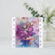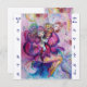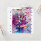 Clown rose, coloré, capricieux, drôle jouant du bugle avec un hibou expressif et des notes musicales joyeuses, fleurs, feuilles en rouge vif, fuchsia, violet, violet, bleu, couleurs blanches, aquarelle de Bulgan Lumini (c)