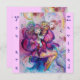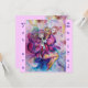 Coloré, fantaisiste, drôle clown rose jouant du clairon avec un hibou expressif et des notes musicales joyeuses, fleurs, feuilles dans des couleurs rouge vif, fuchsia, violet, bleu, blanc, peinture à l'aquarelle par Bulgan Lumini (c)