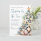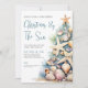 On the bottom right, a large Christmas tree made of beach shells, starfish, and coral adds a whimsical coastal touch, creating an overall teal blue and tan color palette that feels perfect for a laid-back holiday gathering.