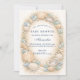 A soft coastal design featuring an elegant oval wreath composed of seashells, oysters, starfish, sea glass, and delicate dune grasses. Neutral sandy tones blend beautifully with muted blue accents, creating a refined seaside aesthetic that feels airy and sophisticated. The warm ivory background enhances the natural textures while keeping the layout clean and graceful. Perfect for a beach-inspired celebration with timeless, understated charm.