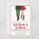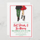Levez un verre à la saison des Fêtes avec cette invitation festive festive et amusante de Noël! Doté d'un couple élégant habillé pour impressionner - la femme en robe rouge chic avec des talons noirs et l'homme en pantalon Père Noël ludique avec un blazer noir tenant une bière - ce design donne le ton parfait pour une nuit de joie. Personnalisez avec vos détails de fête pour des vacances qui ne manqueront pas de vous faire oublier !