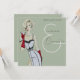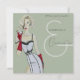 Une femme blonde à l'aquarelle peinte à la main épingle modèle portant une jupe noire et blanche moulante et dessus avec de longs gants de soirée rouges brandissant un martini sur une invitation design de Cocktails d'inspiration moderne et vintage et Conversation Party en vert sauge. Cette invitation est sexy, classe et prête à vous faire personnaliser !