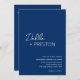 Le bleu marine moderne tout en un faire-part de mariage avec un design simple et minimal avec le nom de la mariée dans un script élégant et le nom du marié dans une police sans serif contemporaine. Vous trouverez ci-dessous, dans le coin inférieur droit, les détails de votre événement dans un agencement minimaliste. Le dos contient vos détails supplémentaires et le code QR, vous pouvez donc sauter la carte de boîtier et la carte RSVP.