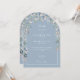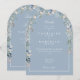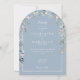 Une invitation de mariage élégante avec arche florale aquarelle de fleurs sauvages avec les détails de votre célébration de mariage dans une typographie blanche chic sur un fond bleu poussiéreux élégant. Avec les détails de votre site web de mariage et votre code QR au verso. Conçu par Thisisnotme