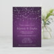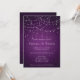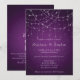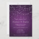 Invitation de mariage avec code QR et guirlande de lumières violettes élégantes sur fond dégradé damassé avec de belles lumières. La couleur et le type de police peuvent être modifiés via le menu d'édition. Ajoutez votre code QR au dos pour la commodité de vos invités pour répondre et voir tous les détails sur votre site Web. Changez simplement l'URL exemple dans le modèle par la vôtre et votre code QR sera généré automatiquement.