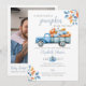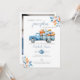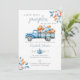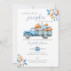 Cette invitation de baby shower élégante présente un automne rustique, des feuilles d'automne et un joli camion bleu rempli de citrouilles. Le verso présente votre photo spéciale et un code QR de registre. Conçu par Thisisnotme©