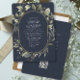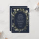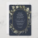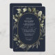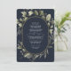 Profitez d'une illustration minimaliste de verdure et d'eucalyptus à l'aquarelle sur un fond bleu nuit contrasté, associée à une typographie calligraphique élégante avec une touche d'ovale couleur or. Économisez de l'argent en ajoutant des détails et un code QR au dos pour que vos invités répondent.
