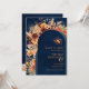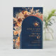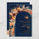 Invitation de mariage save the date moderne et époustouflante avec des éléments floraux bohémiens d'herbe des pampas dans des tons de terracotta et de cottage rustique d'automne avec arche, sur fond bleu marine. Ajoutez l'URL de votre site web de mariage au verso de la carte et le code QR sera mis à jour, ou supprimez-le si non requis. Cliquez sur personnaliser pour inclure vos propres détails.