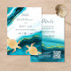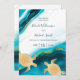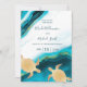 Deux tortues d'or sur un arrière - plan turquoise d'encre d'or. Elégante carte d'invitation de mariage sur la plage. Avec les détails et un code qr scannable pour votre site mariage sur le côté arrière.