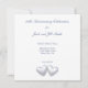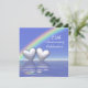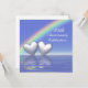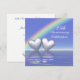 Invitation d'anniversaire de 25 ans en argent avec un arc-en-ciel et deux cœurs argentés brillants flottant sur l'eau bleue. Personnalisez le texte d'exemple au dos avec vos propres informations pour votre événement.