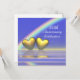 Invitation 50e anniversaire doré avec un arc-en-ciel et deux cœurs dorés flottant sur l'eau bleue. Personnalisez le texte de l'exemple au dos avec vos propres informations pour votre événement.