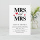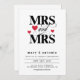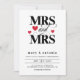 Faire-part de mariage de typographie romantique pour un mariage lesbien avec MRS et MRS. écrit en caractères gras avec un coeur tourbillonnant et rouge. Ajoutez des détails sur votre mariage à l'arrière.