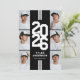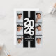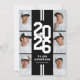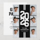 Cartes d'invitation pour la fête de fin d'études athlétique moderne en noir et blanc avec une mise en page accrocheuse de l'année de classe dans une police de caractère universitaire, un collage de photos du diplômé, deux bandes blanches, leur nom, école, et un modèle d'invitation à la fête facilement personnalisable, ces invitations sportives rendront votre célébration inoubliable.