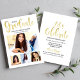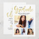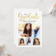 Célébrez votre diplômé avec style avec cette invitation de fête de remise de diplômes moderne avec une en-tête « Diplômé » en écriture dorée et une disposition de collage de 4 photos. Personnalisez avec le nom du diplômé, l'année et les détails de la fête. Le dos est coordonné avec « Célébrons » en écriture dorée et une formulation de RSVP claire.