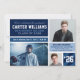 La carte de faire-part de remise de diplômes de style moderne et les invitations à la fête comportent un collage de trois (3) photos du diplômé dans un collage moderne en blocs de couleurs avec motif rayures. Couleurs bleu marine, saphir, bleu poudreux, bleu nuage et blanc.
