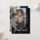 L'invitation à la remise de diplômes présente un design moderne et élégant avec des couleurs noir et blanc. Une carte comporte un grand portrait avec un accent noir incurvé affichant le nom du diplômé en caractères serif gras et "diplômé" en script fluide. La carte Back a une mise en page de style collage avec plusieurs photos, un en-tête noir avec du texte festif dans un mélange de polices script et serif, et des détails d'événement soigneusement arrangés en bas. Le design est élégant, élégant et équilibré.