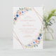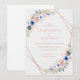 Invitation de mariage moderne florale & géométrique. Dans les couleurs rose doré, pêche & bleu.