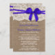 La collection rustique de mariage bleu arc est un design étonnant avec un joli arrière - plan rustique effet burlap avec un cadre romantique vintage effet dentelle blanche et un arc bleu étonnant. Ces invitations peuvent être personnalisées pour votre occasion spéciale et feraient le faire-part parfait pour un mariage, douche nuptiale, fête de fiançailles, fête d'anniversaire et bien plus encore. Veuillez noter que Zazzle ne vend que des invitations imprimées, de sorte que ces invitations n'ont pas de matériel réel de burlap, dentelle ou ruban/arc. AFFICHER LES ÉLÉMENTS CORRESPONDANTS POUR CETTE COLLECTION