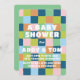 Célébrez le bébé et les parents d'être avec cette approche moderne sur l'invitation baby shower. Un motif arrière - plan de carrés de damier colorés dans une combinaison neutre de genre rose, orange, vert et blues empêche cette célébration de bébé d'être stéréotypée et reflète le parent moderne et une esthétique décontractée.
