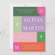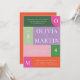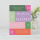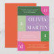 Commencez votre mariage par un début audacieux et lumineux avec ce design d'invitation coloré. Ce design donnera définitivement le ton au FUN ! Cette conception comprend des blocs géométriques de couleurs vives, dont l'orange vif, magenta, rose, vert émeraude et violet. Vos invités seront ravis et ravis de recevoir cette invitation, parfaite pour toute célébration mariage colorée du lever du soleil du jardin à la tropicale.